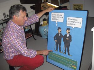 Aan zijn liefhebberij heeft Henk een aantal bijzondere Kuifjeobjecten te danken. ‘Omdat ik iets met Kuifje heb, hebben mensen daar iets mee gedaan. Daardoor ontstonden mooie dingen, niet hoogdravend, maar met een knipoog naar Kuifje en mij.’ Toen Henk vijftig werd lieten collega’s een grote Publexstandaard voor zijn deur plaatsen met speciaal gemaakte posters met Jansen en Janssen erop: ‘Is dat niet Henk die vijftig is geworden?’ ‘Sterker nog: hij is net vijftig geworden!’ (afbeelding 2).