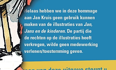 Tja, en als je dan een hommage aan Jan Kruis voor je hebt liggen dan verwacht je toch ook een paar mooie artikelen over zijn allerbekendste creatie? Inderdaad, Jan, Jans en de kinderen. Want hij heeft veel getekend, maar deze familie omvat toch wel het leeuwendeel van zijn complete oeuvre. Maar, helaas! Ik had het in de winkel al gezien, uitgeverij Personalia heeft het op een duidelijk wijze op de cover en binnenin kenbaar gemaakt: