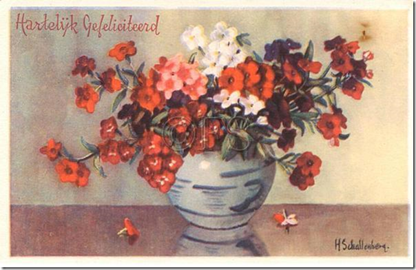 Door Jacques Heemskerk Schallenberg schilderde heel veel van deze bloemstukken. Ook voor ansichten. Bij mij thuis hangen er 14 aan de muur. Het zijn kleine leuke schilderijtjes. Daar fleur je …