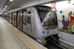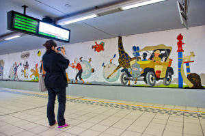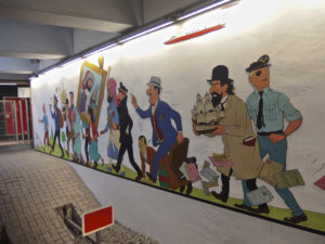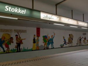 Twee wanden van elk 135 meter lang vormen samen Kuifje in de metro (1988) in Stokkel, een Brussels eindstation. Meer dan 140 figuren uit 22 Kuifje-albums. Hergé maakte de schetsen nog zelf, net voor zijn dood.