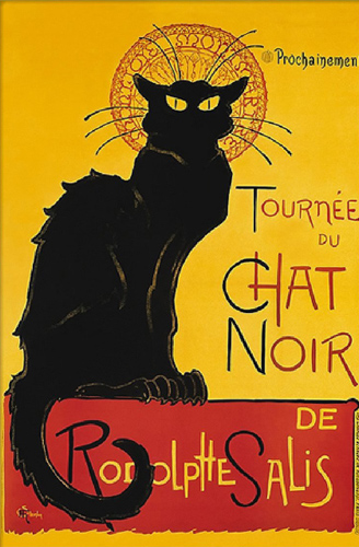 Het bovenstaande affiche is waarschijnlijk één van de allerbekendste affiches uit de gouden periode van de affiche, eind 19e, begin 20e eeuw – niet voor niets ook La Belle Époque genoemd. Geen souvenirwinkel in Parijs waar je hem niet vindt op geëmailleerde platen, koekblikken, dienbladen of onderzetters. Het affiche werd getekend door de in Zwitserland geboren Fransman Théophile-Alexandre Steinlen (1859-1923).