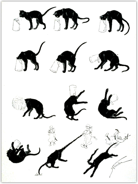 Nu kwam ik er per toeval achter, dat deze Steinlen een echte kattenliefhebber was en dat hij zijn katten vaak heeft getekend. Een bekendere serie tekeningen is die van een zwarte kat die allerlei avonturen beleeft – we spreken van begin 20e eeuw, dus we mogen gerust spreken van pionierswerk op het gebied van stripverhalen.