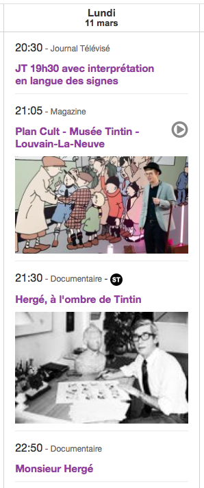 De Franstalige Belgische tv-zender RTBF heeft volgende week, 11 maart, een hele avond Hergé op de tv. De programma’s worden uitgezonden op hun derde net, ‘La Trois’.
