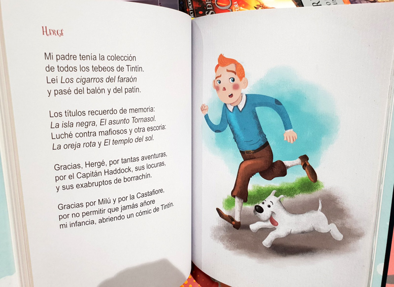 Onlangs verscheen dit Spaanse boek met ‘Kleine Sonnetten’ met de ondertitel ‘Voor rusteloze meisjes en jongens’. Het is geschreven door Victor Alfaro en geïllustreerd door Iván Alfaro – een familiezaakje dus. Ik zag alleen de pagina met het sonnet over Hergé – maar ik ga ervan uit dat de teneur van alle gedichten hetzelfde zal zijn: een liefdevolle jeugdherinnering.