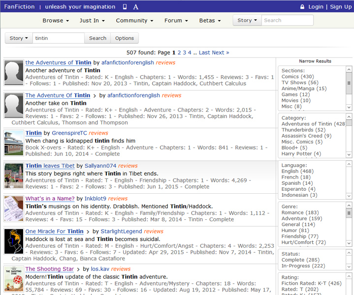 Zoek op termen als Tintin (507 hits op deze term), Haddock (1093 hits – maar een deel daarvan heeft niets met onze kapitein te maken, maar wel met haddock ofwel schelvis), Castafiore (slechts 10 hits) en je kunt even vooruit: er zijn vervolgen op Kuifje-albums, er zijn nieuwe verhalen, er zijn overpeinzingen van Kuifje.