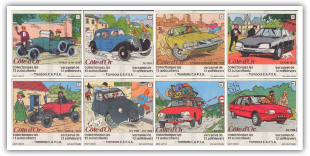Heel amusant vond ik de uitweidingen over de reclame-uitgaven en tekeningen die door de Studios gemaakt werden, ook na de dood van Hergé. De auteur van het artikel is duidelijk niet over te spreken over de aantasting van de ‘klare lijn’ en al helemaal niet over de advertenties met een ingeplakte foto van een Citroën 2CV – zie het fotobijschrift hierboven.