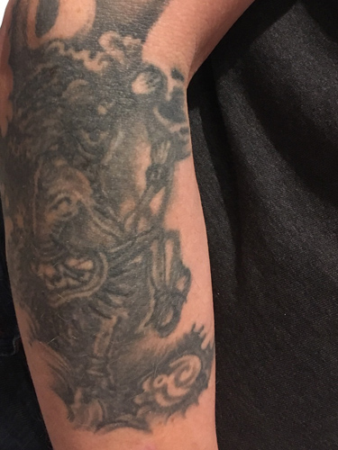 Een vlaag van verstandsverbijstering? Integendeel. Een weloverwogen besluit. De nu 44-jarige Boris De Bisschop kijkt met veel trots terug op de afgelopen jaren, waarin stap voor stap de Kuifje figuren letterlijk tot leven zijn gekomen op zijn lichaam. ‘Het idee ontstond toen ik vijfentwintig jaar was. Ik hield al van Kuifje sinds mijn zevende en ik besefte dat ik die ook nog op mijn 77e zou willen zien. Maar toen is dat bij een idee gebleven. Pas toen ik dertig werd kwam de eerste tattoo. En dat is Kuifje uit het album De Scepter van Ottokar.’