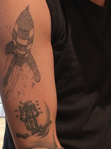 De eerste tattoo smaakte naar meer. En wat zou Kuifje zonder zijn viervoeter zijn. De tweede tatoeage laat zich raden: dat werd Bobbie. Maar ook daarna waren de smaken van Boris nog niet op. Als derde kwam Rascar Capac op het lichaam. Net als Bobbie prijkt hij op de rechterarm van Boris. En geloof het of niet, er was bovenaan nog een plekje over voor de vierde en voorlopig laatste tattoo: de Kuifje raket. En van al die ‘vereeuwigde’ plaatjes geniet Boris nog elke dag. ‘Kuifje is een deel van mijn persoonlijkheid en de tattoo’s zijn dat ook, want ik ben met hem meegegroeid en Kuifje is een personage waar ik tegenop keek als kind. Al vind ik het nu wel jammer dat Kuifje nooit drinkt en niet naar vrouwen kijkt, maar dat is nu eenmaal zo. Hij blijft hoe dan ook in mijn leven’, zegt Boris lachend. En dat krijgen zijn kinderen ook van hem mee. ‘Ik heb twee zonen van 13 en 16, die ik dat al van jongs af aan probeer door te geven. In het begin zag m‟n jongste zoon Kuifje en dan dacht ie dat ik het was. Want hij linkte Kuifje aan Kuifje op mijn kuit. Naast de stripboeken heb ik vaak de tekenfilms met ze gekeken. En ik moet bekennen dat ik alvast spullen dubbel probeer te verzamelen. Zodat als ik ooit kom te overlijden, ze daar geen ruzie over hoeven te maken. Al merk ik dat het verzamelen er vooral bij de jongste in zit.’