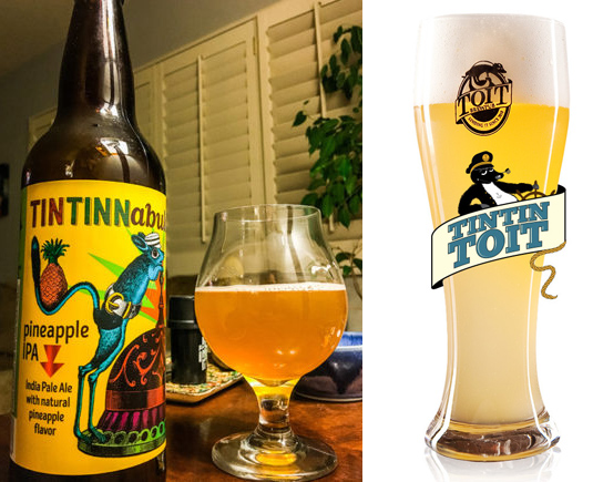 Dan vond ik ook nog twee biermerken die niets met Kuifje te maken lijken te hebben, maar toch de aandacht trokken. Links een met ananas op smaak gebrachte IPA (India Pale Ale) en ‘Tintin Toit’ – met een plaatje dat eerder aan Haddock doet denken dan aan Kuifje. Wordt hier op vindingrijke wijze een aanvaring met Moulinsart omzeild?