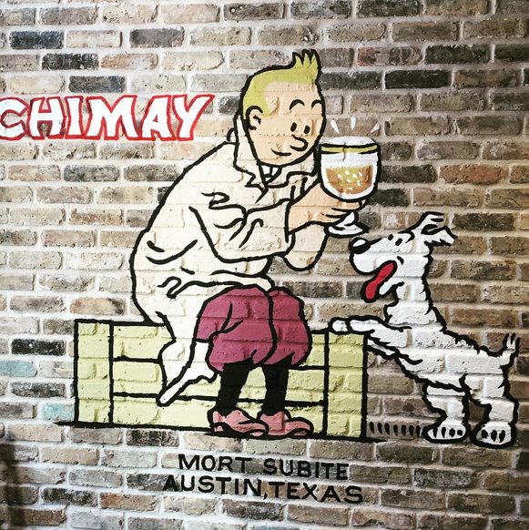 Het zal misschien te maken hebben met de tropische temperaturen deze dagen, maar ik ging eens kijken of er meer te vertellen is over Kuifje en bier. Ik kwam deze muurschildering tegen in een café in Austin, Texas. Kuifje zelf lijkt nog te twijfelen of hij een slokje zal nemen, maar Bobbie heeft duidelijk dorst.