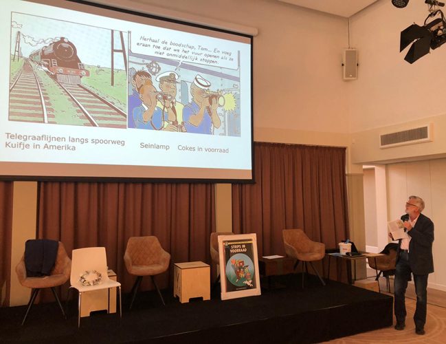 Het volgende hoogtepunt betrof een lezing met als thema ‘Communicatie in Kuifje, een reis door de tijd’van Ruud Maltha, gepensioneerd KPN-ingenieur en vrijwilliger bij Beeld & Geluid. Ook Ruud had er erg veel werk van gemaakt en trakteerde het publiek op een kleurrijk en beeldend verhaal over de geschiedenis van de telecommunicatie, op basis van de allereerste Kuifje albums tot en met de Alfa-Kunst. Ruud bleek een smakelijk verteller en het publiek hing aan zijn lippen. Wist u bijvoorbeeld van het bestaan van de Politietelefoon, of de Spoorwegtelefoon? Het komt allemaal voor in Kuifje. Ruud vertelde verder over de geschiedenis van de Morse-code, waarbij we o.a. de seinlamp uit Cokes voorbij zagen komen, we zagen het witte Ericsson draaischijftoestel – een zeldzaamheid in die tijd, volgens Ruud – uit de hertekende versie van Rotsen en nog veel meer moois. In het halletje voor de zaal had Ruud een selectie aan werkende toestellen uit de collectie van Beeld & Geluid verzameld; allemaal afgebeeld in de Kuifje-albums, in de meeste gevallen zeer natuurgetrouw, zoals we van Hergé en zijn medewerkers mogen verwachten. De lezing was dusdanig interessant dat de redactie van Duizend Bommen! intussen aan het kijken is of we hiervan, in samenwerking met Ruud, een mooi artikel kunnen maken.