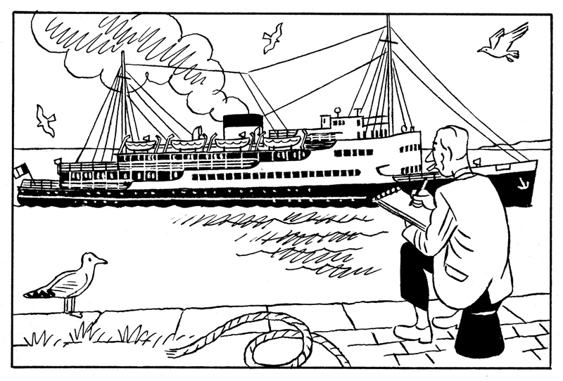 Uit het persbericht: ‘Dit boek is in de eerste plaats een ‘verhaal in beelden’, waarin de tekeningen van Stanislas Barthélemy, de historische foto’s en de maritieme illustraties van weleer elkaar opvolgen en aanvullen. De tekst is slechts een fijne rode draad die deze visuele pareltjes aaneenrijgt. Dit album is volledig gewijd aan een schip, de ‘Prince Baudouin’, een van ferry’s die in 1937 België met Engeland verbond en die datzelfde jaar zowel Kuifje als Hergé mocht overzetten naar het land van ‘De zwarte rotsen’. Deze flamboyante Oostendse veerboot was toen de modernste en snelste van zijn soort, de trots van het ganse koninkrijk. Spring aan boord, neem plaats op het opperdek, adem de gezonde zeelucht in en geniet ten volle van deze tocht op zee en in de tijd. Oef, u bent net op tijd, het avontuur mag beginnen !’