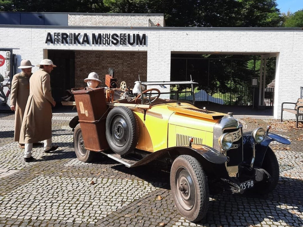 Tijdens de pauze kreeg iedereen een goed gevuld lunchpakket, geheel op kosten van onze vereniging. De inhoud hiervan werd door de aanwezigen buiten genoten, in de nabijheid van de “hutjes”. Toen kon ook de oldtimer, uit de jaren twintig van de vorige eeuw, die helemaal in Kuifjestijl was opgetuigd bewonderd worden. Het voertuig, bestuurt door twee “missionarissen” maakte speciaal voor de aanwezigen nog een rondje op het terrein.