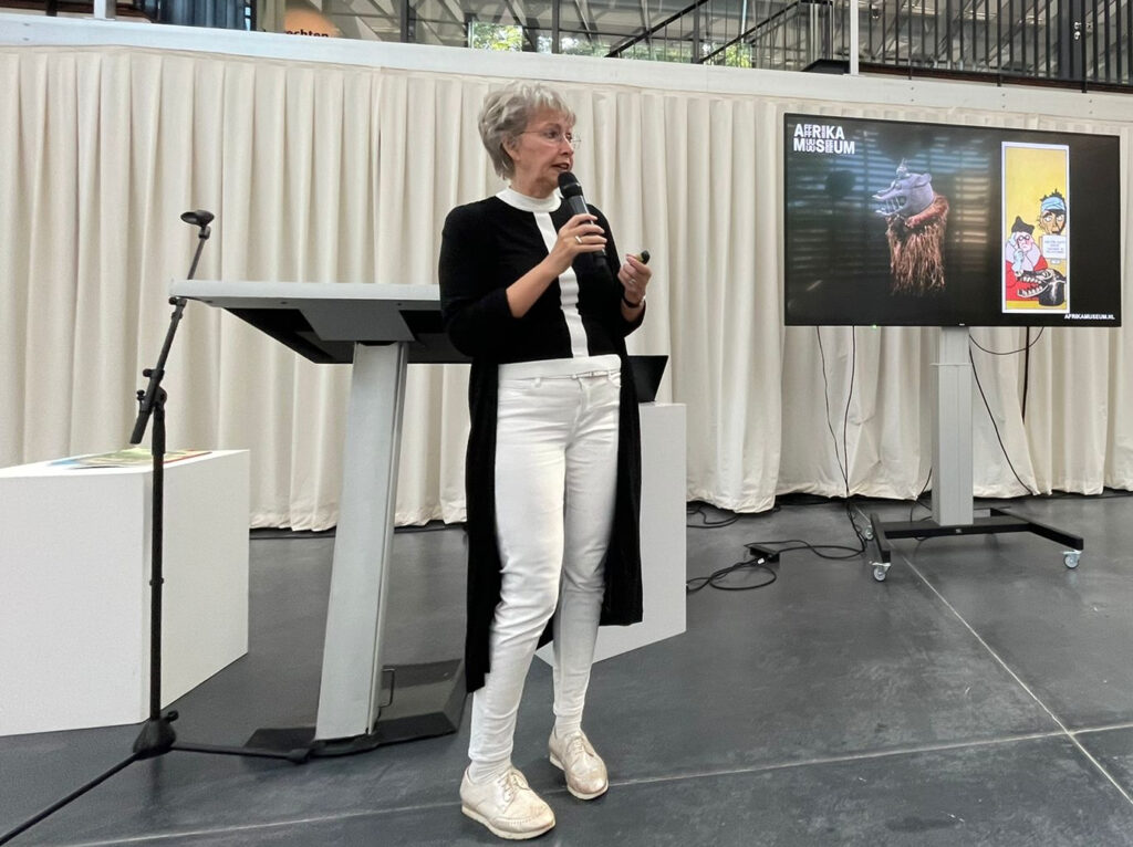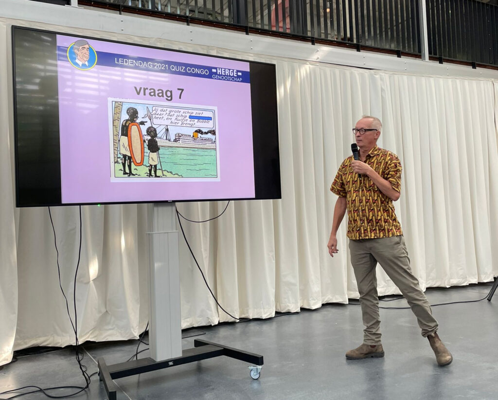 Rond 11 uur heette de voorzitter de aanwezigen welkom en kondigde hij het eerste deel van het officiële programma aan. Dat was een boeiende lezing met de titel “Afrika in Kuifje”, die werd gegeven door Drs. Ypke Veenstra. Zij vergeleek o.a. de in diverse musea te vinden Afrikaanse kunst met afbeeldingen in de albums van Kuifje. Het bleek dat Hergé zich vaak beter gedocumenteerd had voor de collectie in het “Ethnographisch museum”, die voorkomt in Het gebroken Oor, dan voor de Afrikaanse voorwerpen uit Kuifje in Afrika. Iedereen weet inmiddels wel dat dit laatste verhaal tegenwoordig erg omstreden is. Men heeft nu hele andere denkbeelden over de inwoners van Afrika dan ruim 90 jaar geleden, toen Hergé dit verhaal verzon. Tegenwoordig rust er bv. een taboe op het gebruik van bepaalde woorden, dat bleek ook tijdens de lezing. Woorden als “fetisj” en “tovenaar”, begrippen uit het werk van Hergé, worden door de medewerkers van het museum niet meer gebruikt. Mevrouw Veenstra legde ons uit dat ze vervangen zijn door “krachtbeeld” en “religieus specialist”. Dit en ook andere onderdelen van de presentatie leidde tot steeds weer nieuwe opmerkingen en vragen uit het publiek en zelfs tot een kleine discussie; waarom zijn de taboe woorden vervangen door andere woorden die erg algemeen en weer erg westers klinken? Eén ding werd in ieder geval duidelijk; de analyse van de door Hergé geschetste beelden (letterlijk en figuurlijk) zorgde voor boeiende discussies en stof tot nadenken.