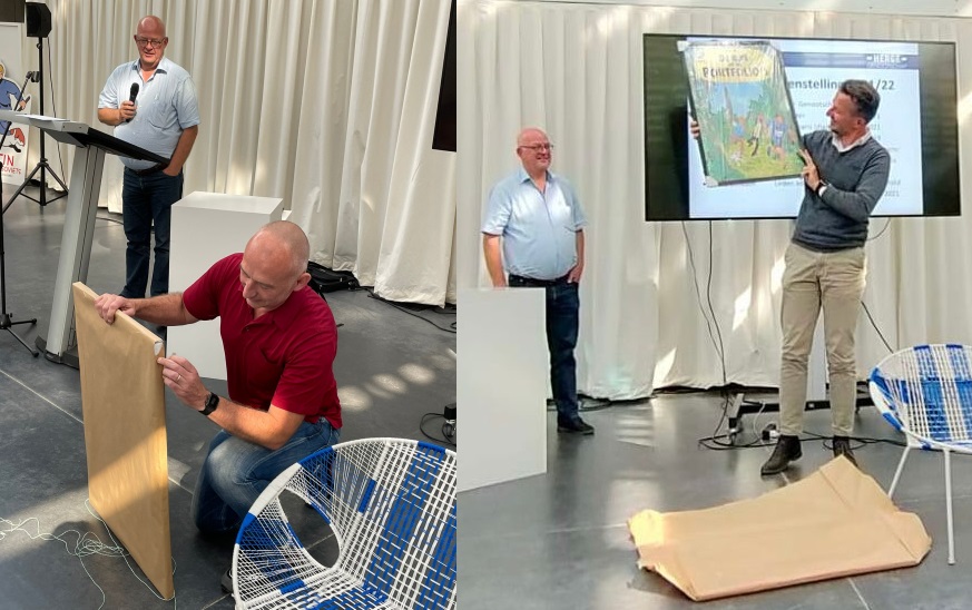 Hierna werd de uitslag van de quiz bekend gemaakt. Niemand had het antwoordformulier foutloos ingeleverd, de quiz behoorde dit jaar dus weer tot één van de moeilijke. Steven Gielen had de minste fouten gemaakt en was dus de winnaar. En daarmee werd het wel een hele speciale dag voor Steven; hij maakte de beide afscheidscadeaus voor de vertrekkende bestuursleden, glorieerde als quizwinnaar èn was ook nog eens de schrijver en vormgever van de Ledendag gadget. Dit jaar een zeer fraai boekje met de titel “Kuifje in het Afrika Museum”, geproduceerd in een genummerde oplage van slechts 100 stuks. De aanwezige leden konden het boekje aan het einde van het serieuze gedeelte van de dag aanschaffen. En ik zag dat sommigen het ook nog lieten signeren door Steven in een poging de uniciteit nog meer te verhogen. Voor de statistici en de verwoede verzamelaars; er zijn al 67 exemplaren verkocht!