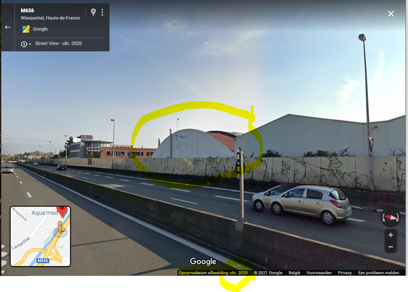 Kris zocht ook op of de muurschildering te vinden zou zijn in Google Streetview, zoals ik geprobeerd had het gebouw te vinden (op de verkeerde locaties…). Verrassing: de gevel is maagdelijk wit op deze foto, die dateert van oktober 2020 (zie onderaan de opnamedatum). Dus: de muurschildering is van recente datum.