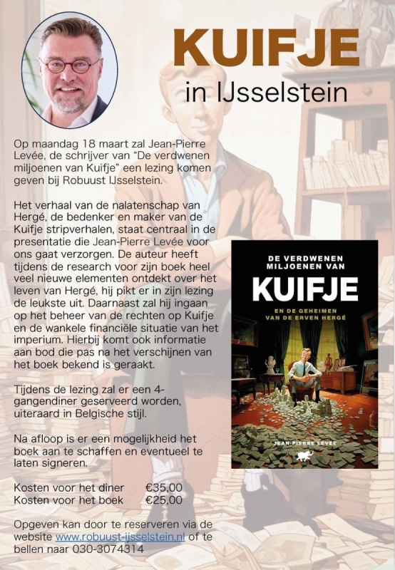 Los van het Hergé Genootschap, maar wel Hergé-gerelateerd, is er zondag 10 maart jl in Wageningen nog een maal de Spielberg Kuifje-film gedraaid in een bioscoop, na een interessante inleiding van Martin Koolhoven. Verder houdt op maandag18 maart Jean-Pierre Levée, de schrijver van De verdwenen miljoenen van Kuifje – De geheimen van de erven Hergé in IJsselstein (Ut) een lezing, onder het genot van een Belgische maaltijd.