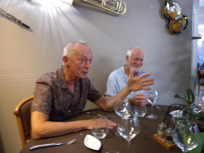 Thomas gunt ze mij van harte en de tijd leert dat hij de volgende dag eenzelfde Haddock koopt, een maat groter, dus dat is ook opgelost. Intussen zijn ook Leo en Jessy aangekomen en drinken we gezellig wat.
