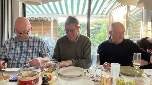 Op de kalender zien we dat het Jubeljaar nu, eind april 2025, officieel ten einde is; de Jubileumcommissie is derhalve bij deze opgeheven. Om deze situatie luister bij te zetten, besloten we tot een slot-etentje. Het had wel wat voeten in aarde om iedereen op hetzelfde moment bij elkaar te krijgen. We vonden dat toch wel een vereiste, omdat op alle vergadermomenten ook steeds iedereen aanwezig was geweest. De keus viel uiteindelijk op de vooravond van Koningsdag, vrijdag 25 april 2025. Loekie nodigde ons allen gastvrij uit om naar het hoge noorden te komen.