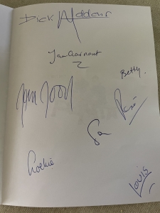 Namens de hele JC overhandig ik Loekie na de bloemen ook twee Kuifjepuzzels, die ze maanden geleden in de groepsapp genoemd had. Jan Aarnout biedt haar een 1-aprilgrap-theedoosje aan en Loekie en Marco vertellen in geuren en kleuren hoe zij erin getrapt waren. Verder had ik, uitgaande van de gedachte aan een kaartje met een toepasselijk plaatje voor aan de bloemen, bedacht dat er iets moest komen waar we allemaal onze naam op zouden zetten. Omdat mijn printer dienst weigerde, had ik Jan Aarnout geappt om hulp en zo kwamen we uit op een stapeltje kaarten met toepasselijke eetplaatjes uit Kuifje, waar iedereen zijn naam op kan zetten en die we ook zelf mee naar huis kunnen nemen als aandenken. Deze rouleren ter signering tijdens de maaltijd.