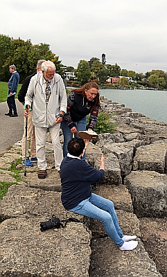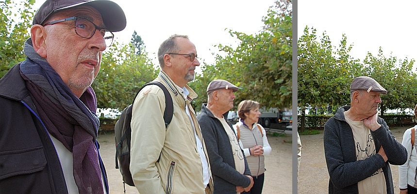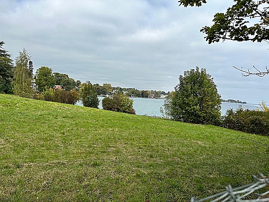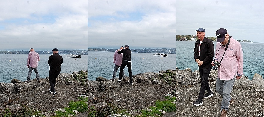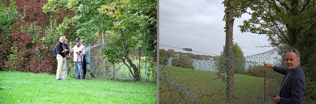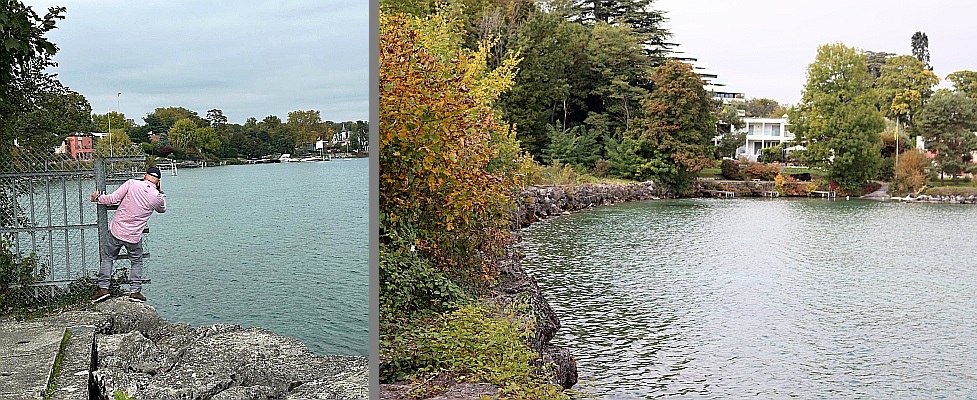 Na de lunch in het station rijden wij, met 12 mensen naar het meer van Genève, naar de plaats waar volgens onderzoek de taxi met onze helden het water in reed, blz. 20-21. Achter het hek, ja daar, kunnen we de plek zien waar Hergé het liet gebeuren.