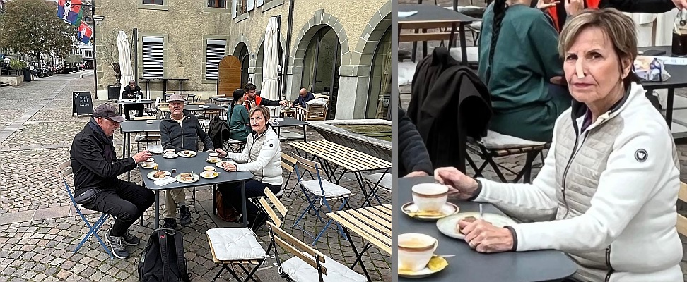 Onze volgende stop is Nyon, waar we de overige vier weer treffen. Zij hebben zich intussen zo te zien ook goed vermaakt. Maar wat is er met de neus van Hanneke? Heeft zij hem gestoten?