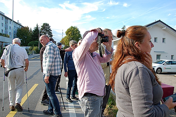 Het ontvangstcomité in Nyon, maar wat heeft Jan Joost nou aan zijn pet hangen?