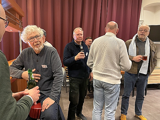Ton en zijn hulpen hadden de ruimte ingericht: een deel waar het beeldscherm hing en stoelen voor de luisteraars klaar stonden en gescheiden door een harmonicawand was het andere deel met de bar, waar tafels klaar stonden en waar het eten opgesteld werd.