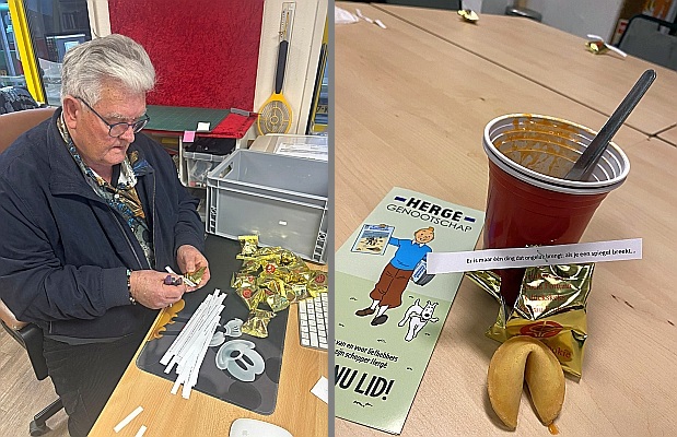 De naambordjes lagen keurig klaar bij binnenkomst en ik legde er wat nieuwe folders van het HG bij. Het was een blij weerzien en erg leuk elkaar zo te ontmoeten. Ton en ik hadden fortune cookies bedacht, dat leek ons wel passend op een avond over bijgeloof. We wilden eigenlijk toepasselijke kreten uit de albums in de koekjes laten meebakken, maar dat lukte niet op korte termijn. Marcel (zie de foto hieronder) werd bereid gevonden aan elk koekje een Hergé-kreet te nieten. De koekjes werden op de tafels verspreid en zijn inmiddels felbegeerde collectorsitems geworden (mits met de bijpassende tekst natuurlijk).