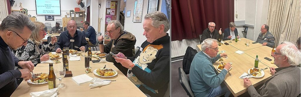 Ik hield de tijd nauwlettend in de gaten en het viel me wel op dat hij er aardig de gang in had. Af en toe gebaarde ik met 10 resp. 5 vingers hoeveel spreektijd hem nog restte. Toen ik 2 vingers opstak, zei hij tegen het publiek: “Betty gebaart dat ik nog tien minuten heb”. (Leuk klusje: “Betty bewaakt het strakke schema!” Bedankt, Ton!). Desondanks liep JAB niet al te veel uit en konden we aan het hoofdgerecht beginnen. Het was goed verzorgd, lekker en gezellig.