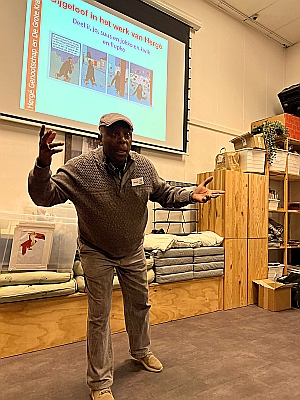 Na het hoofdgerecht was het de beurt aan Renold. Hij refereerde aan een ledendag van het HG, in het Afrikamuseum in Berg en Dal. Daar werd onder meer gesproken over de beeldvorming van gekleurde mensen in het album Kuifje in Afrika, maar er was toen weinig tijd om aandacht te besteden aan hoe donkere mensen het album beleven. Renold vertelde over zijn herinneringen aan zijn jeugd in Suriname, over de opvoeding door zijn oma en hoe het later was om als man van kleur verder in Nederland op te groeien.
