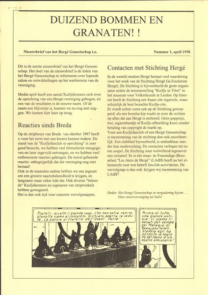Begin April 1998 was het Hergé Genootschap nog niet opgericht. Een klein groepje fans had elkaar gevonden en er was een besluit genomen om concrete stappen te gaan ondernemen. Eén daarvan was de start van een nieuwsbrief, toen nog Duizend Bommen en Granaten genoemd. Minder dan een jaar later was de vereniging werkelijk opgericht en ging het ’tijdschrift’ Duizend Bommen heten, en de nieuwsbrief kreeg met ‘sapristi’ een andere naam.