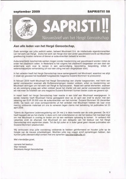 September 2009, de impasse duurde voort. In dit nummer van Sapristi werd de leden duidelijk gemaakt dat er nog geen schot zat in de onderhandeling. En dat was besloten om de publicatie van duizend Bommen tijdelijk te staken, maar de nieuwsbrief ging gelukkig wel door.