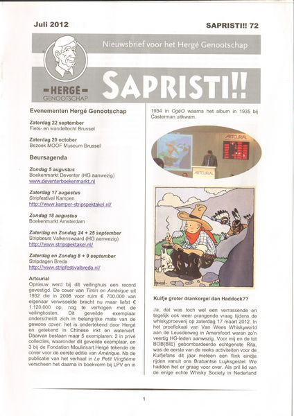 Sapristi 72 verscheen in Juli 2012. We zien een afbeelding in kleur. Maar, niet iedereen kent deze versie. Sinds enige tijd bestaan er namelijk twee versies, de originele die in kleur wordt opgemaakt, en de gedrukte, die ‘slechts’ in wart/wit wordt gedrukt. de leden die er behoefte aan hebben, konden bij Gé Bom ook een PDF van de originele versie via de mail ontvangen; daar is dit dus een voorbeeld van!
